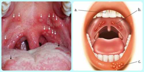 Распространение инфекции в горле на лимфоидные железы глоточного кольца гланды приводит к развитию герпетиче ской ангины. Кроме высыпания на слизистых рта и горла, подобные элементы могут появляться на коже преддверия носа, на веках глаз. Пузырьки везикулы имеют свои этапы развития. Еще до их появления кожа слизистая в этих местах начинает зудеть и несколько краснеет. Затем появляется маленький водянистый пузырек, со временем увеличивающийся в размерах. Пузырек содержит в себе бесчисленное количество вирусных телец. Вскрытие пузырька и выделение в окружающую среду вируса простого герпеса происходит самопроизвольно в период от двух до семи дней с момента его появления. Оставшаяся язвочка затем заживает без образования рубцов. Кожа и слизистые вокруг высыпаний полнокровны и выглядят отечно. Пузырько видная сыпь сильно зудит и вызывает у ребенка навязчивое желание её почесать, что вызывает ответную резкую боль в местах высыпаний , фото проявления герпетиче ской инфекции. Дети начинают отказываться от еды по причине резкой болезненности при глотании, появляется излишнее слюноотделение, сопровождаемое резким запахом изо рта. При этом увеличиваются в размерах и становятся болезненными при пальпации группы подчелюстных лимфоузлов, а также верхней трети шеи. Высокая температура тела обычно сопровождает весь период высыпания патологических элементов. Проводимая в это время жаропонижающая терапия малоэффективна. Пока на кожных покровах и слизистых горла образуются новые везикулы общее состояние ребенка остается тяжелым прогрессирует слабость, ребенок жалуется на тошноту, мышечные и головные боли. Герпес в горле продолжается от одной до двух недель. Состояние больного начинает улучшаться постепенно, после прекращения новых подсыпаний. Стоит отметить, что встречаются и тяжелые формы герпетиче ской инфекции, заканчивающиеся смертью больного.